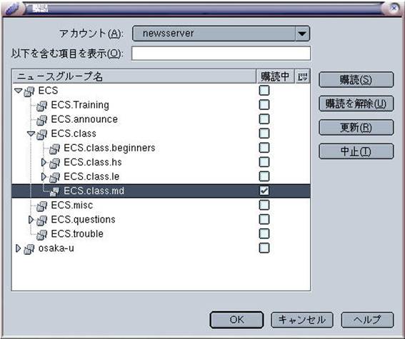 すると、次のウィンドウが出ますので、購読したいニュースグループを選択して、購読を選択します。「ECS」→「ECS. Class」→「ECS class.md」の順番に選んでください。「ECS